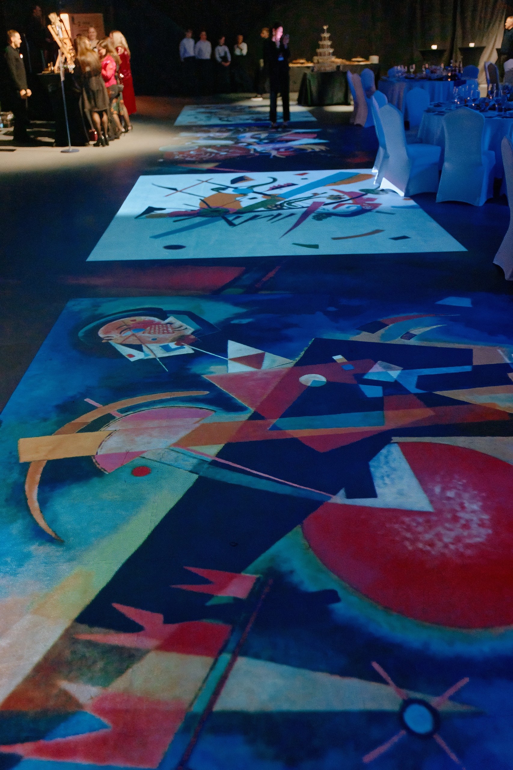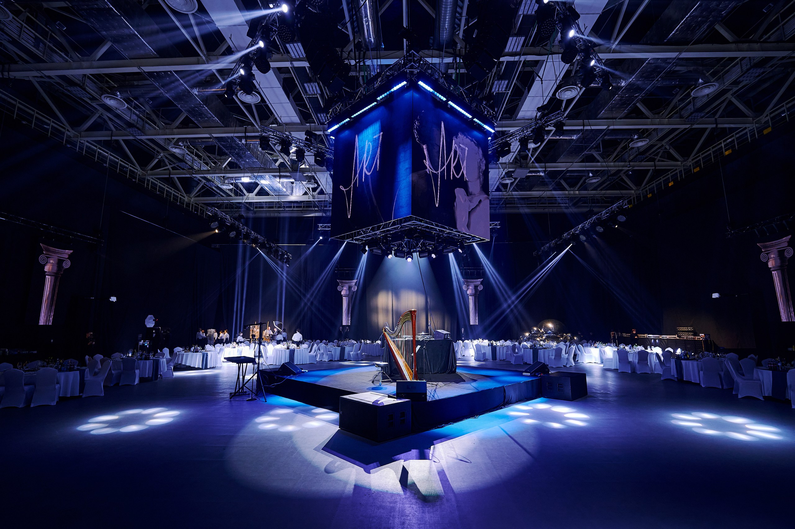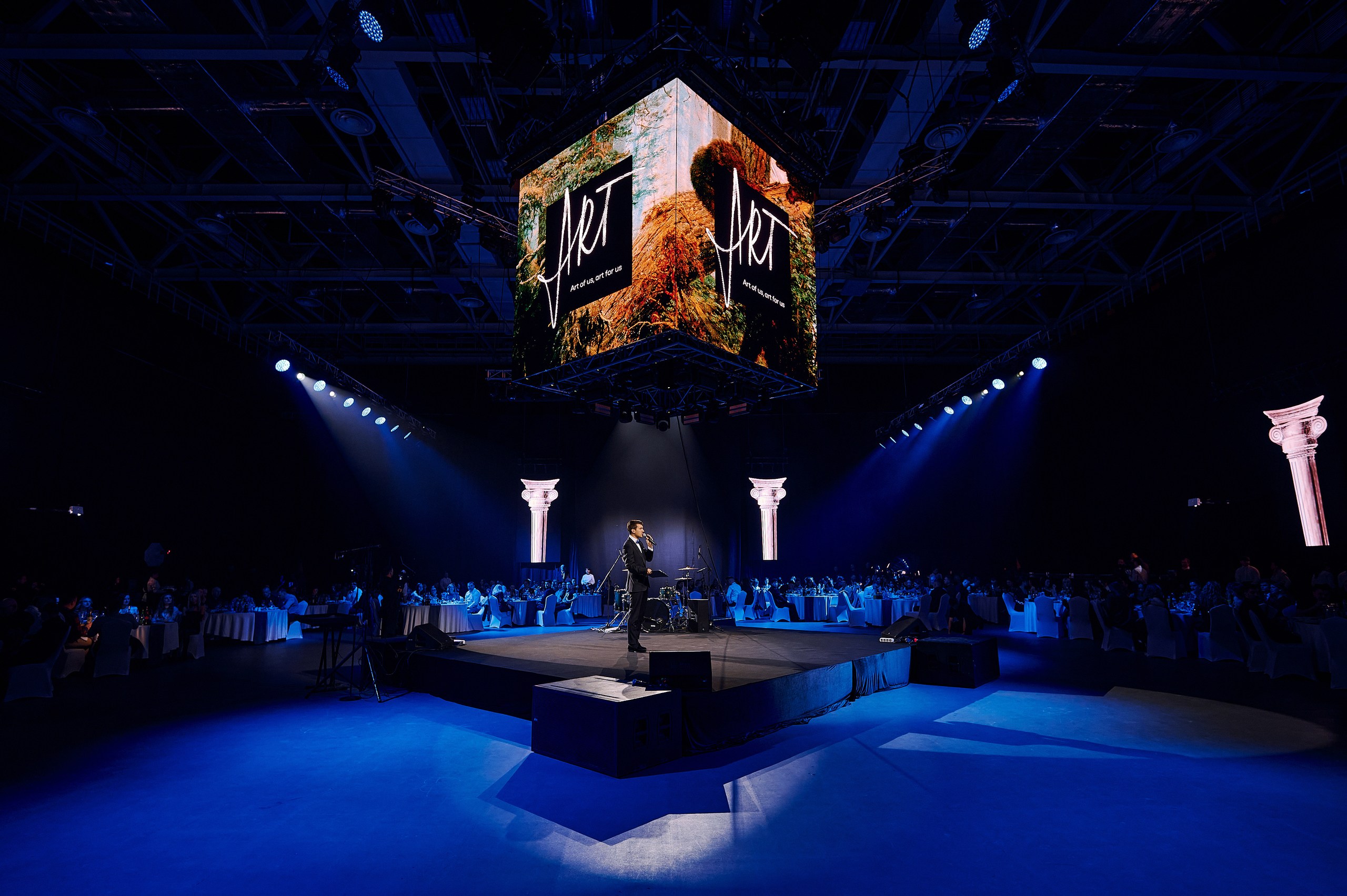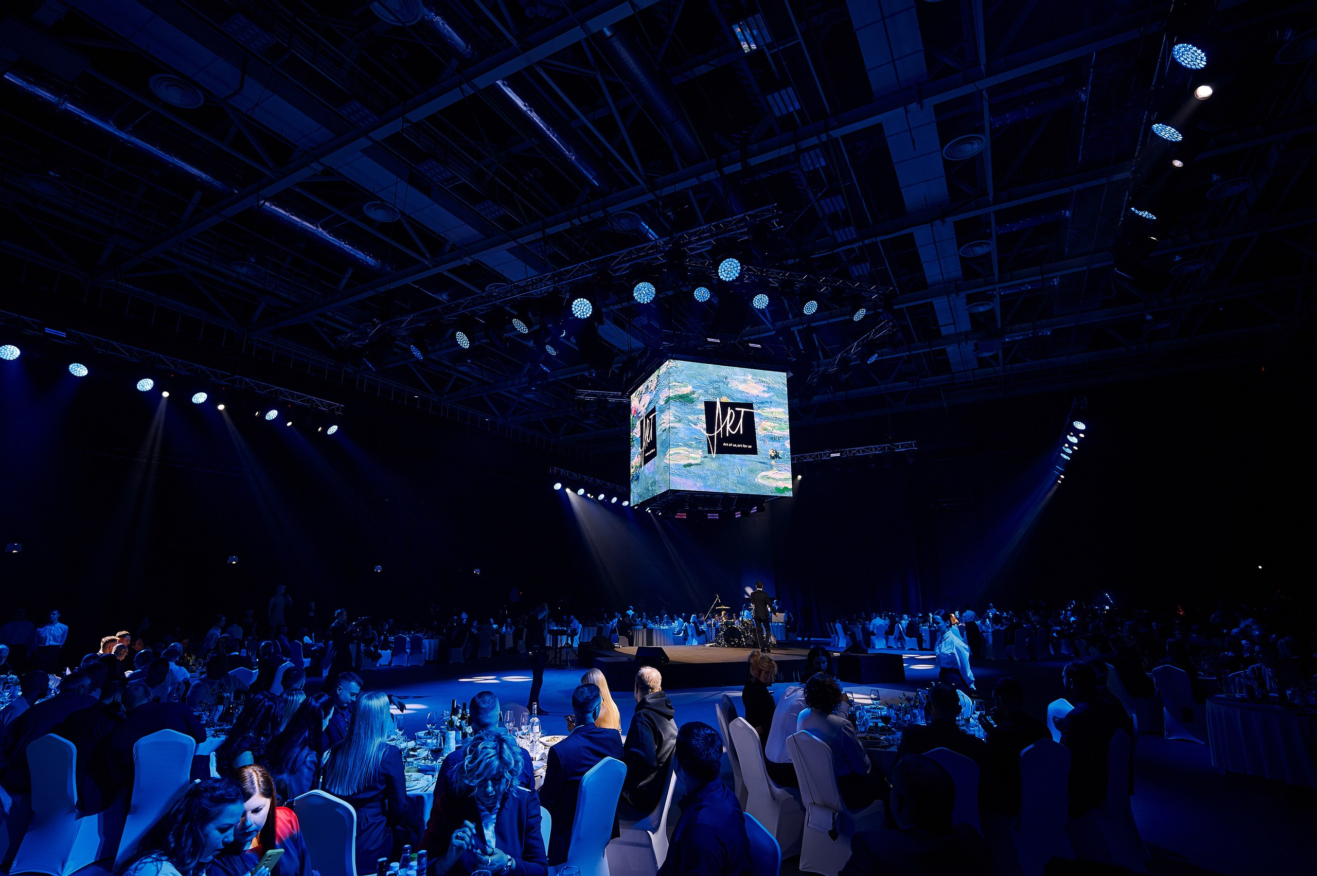 • Сценография: пол, залитый ожившими проекциями знаменитых полотен, центральная сцена под светящимся LED-кубом для идеального обзора, зеркальные шары, LED-экраны по периметру зала и свет, как главный художника вечера.