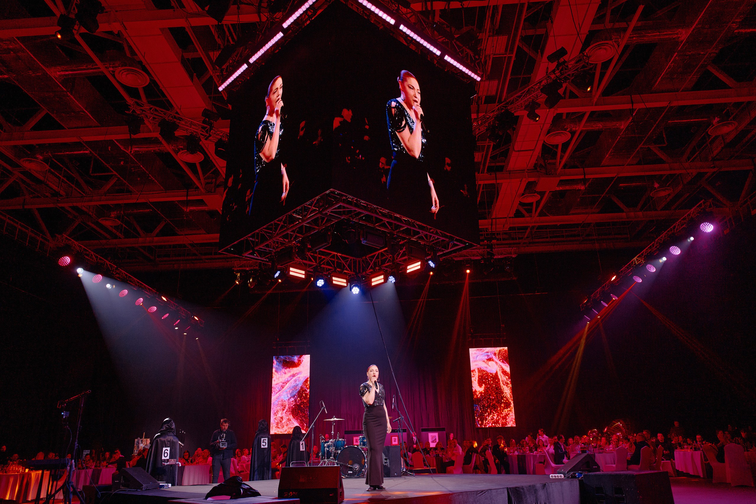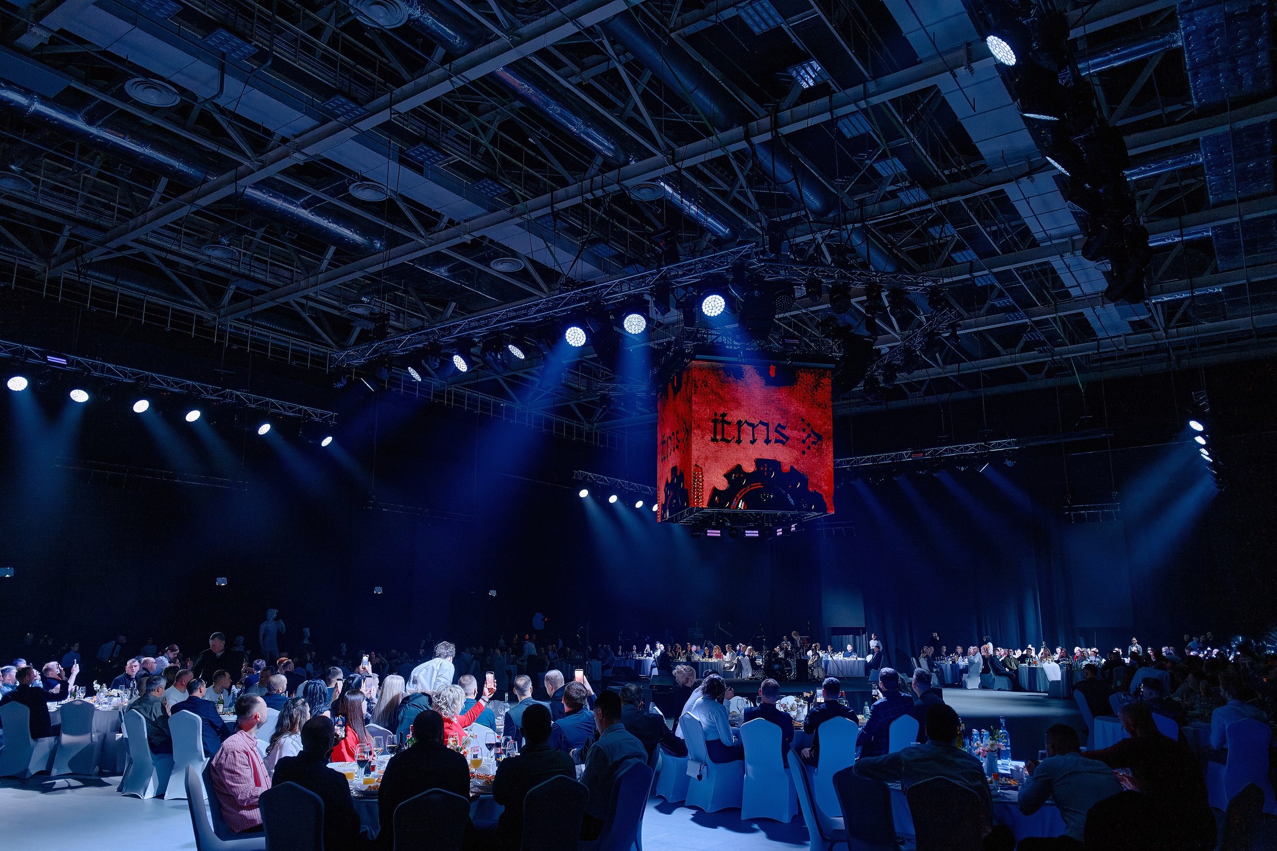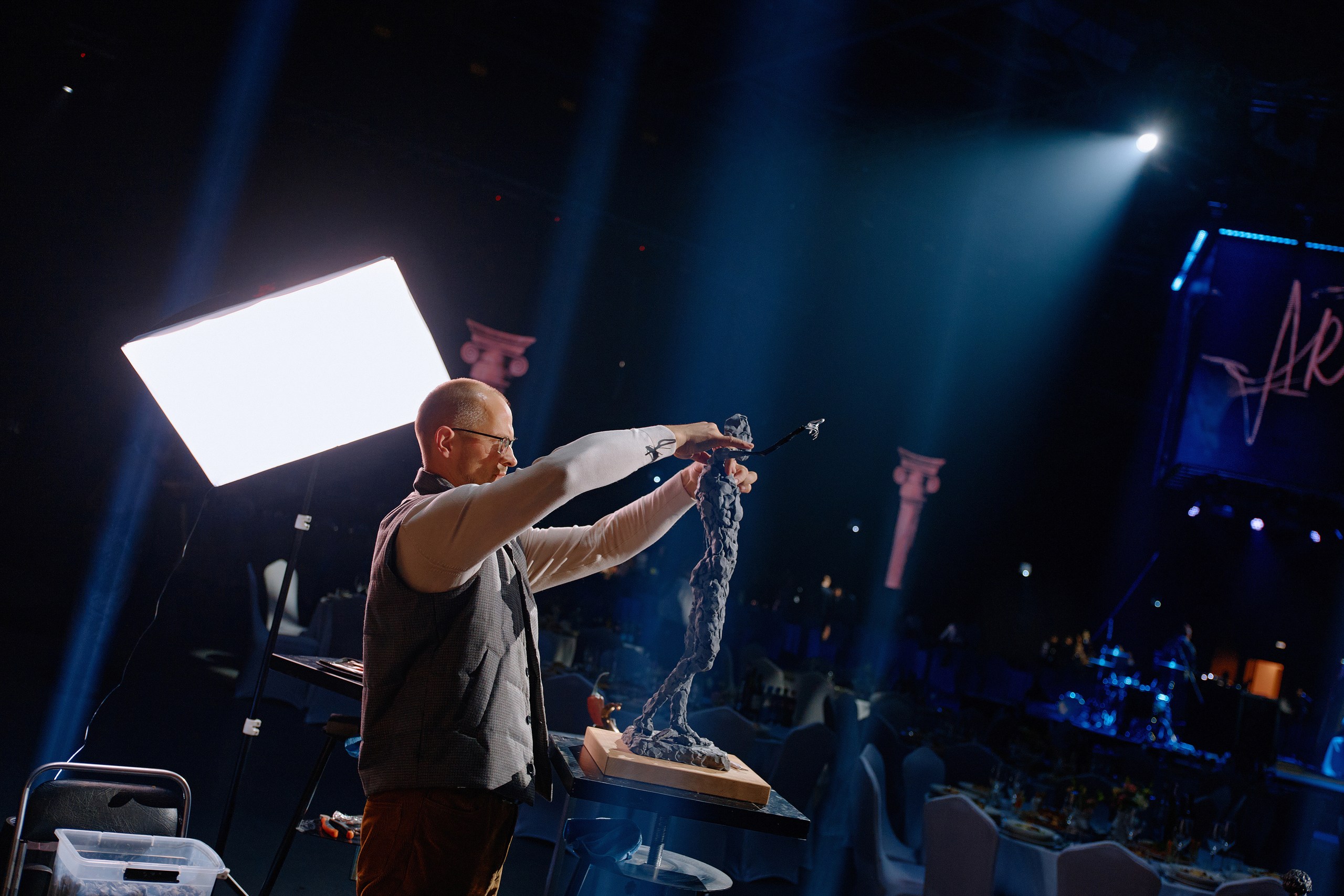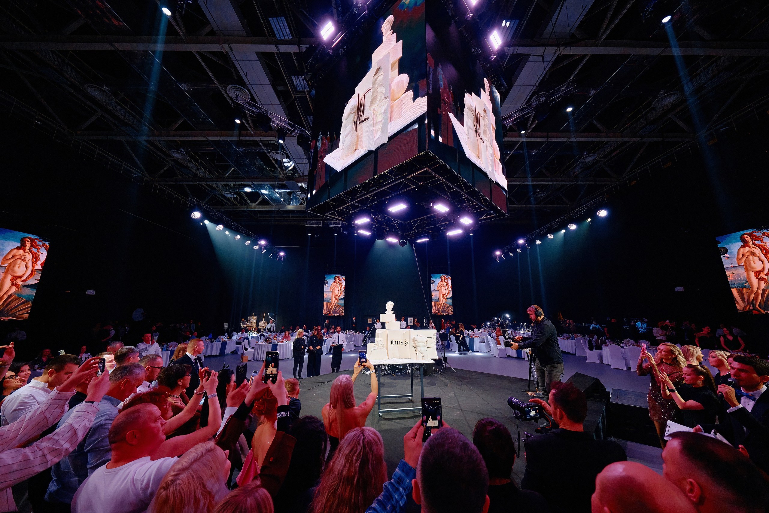 • Сценография: пол, залитый ожившими проекциями знаменитых полотен, центральная сцена под светящимся LED-кубом для идеального обзора, зеркальные шары, LED-экраны по периметру зала и свет, как главный художника вечера.