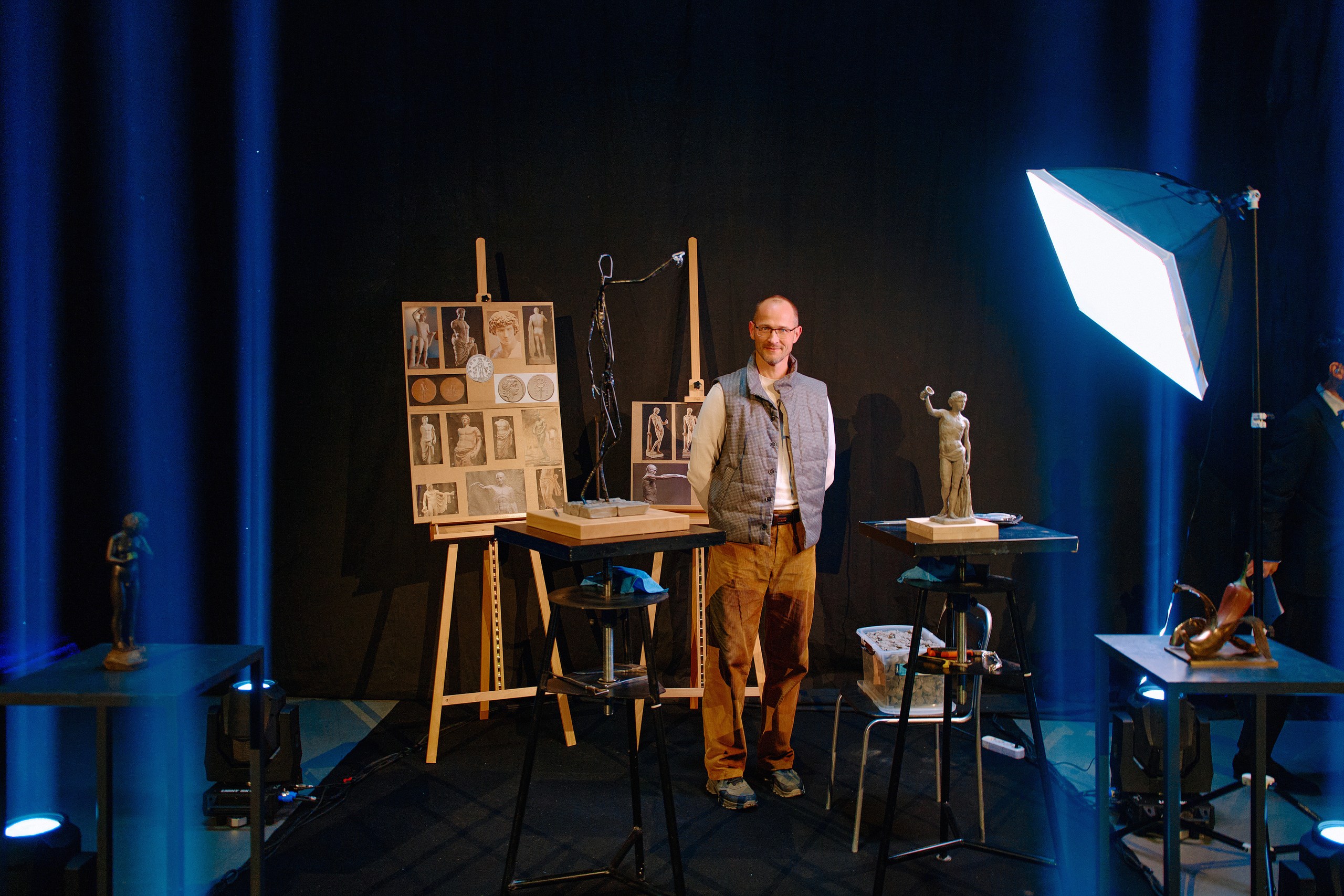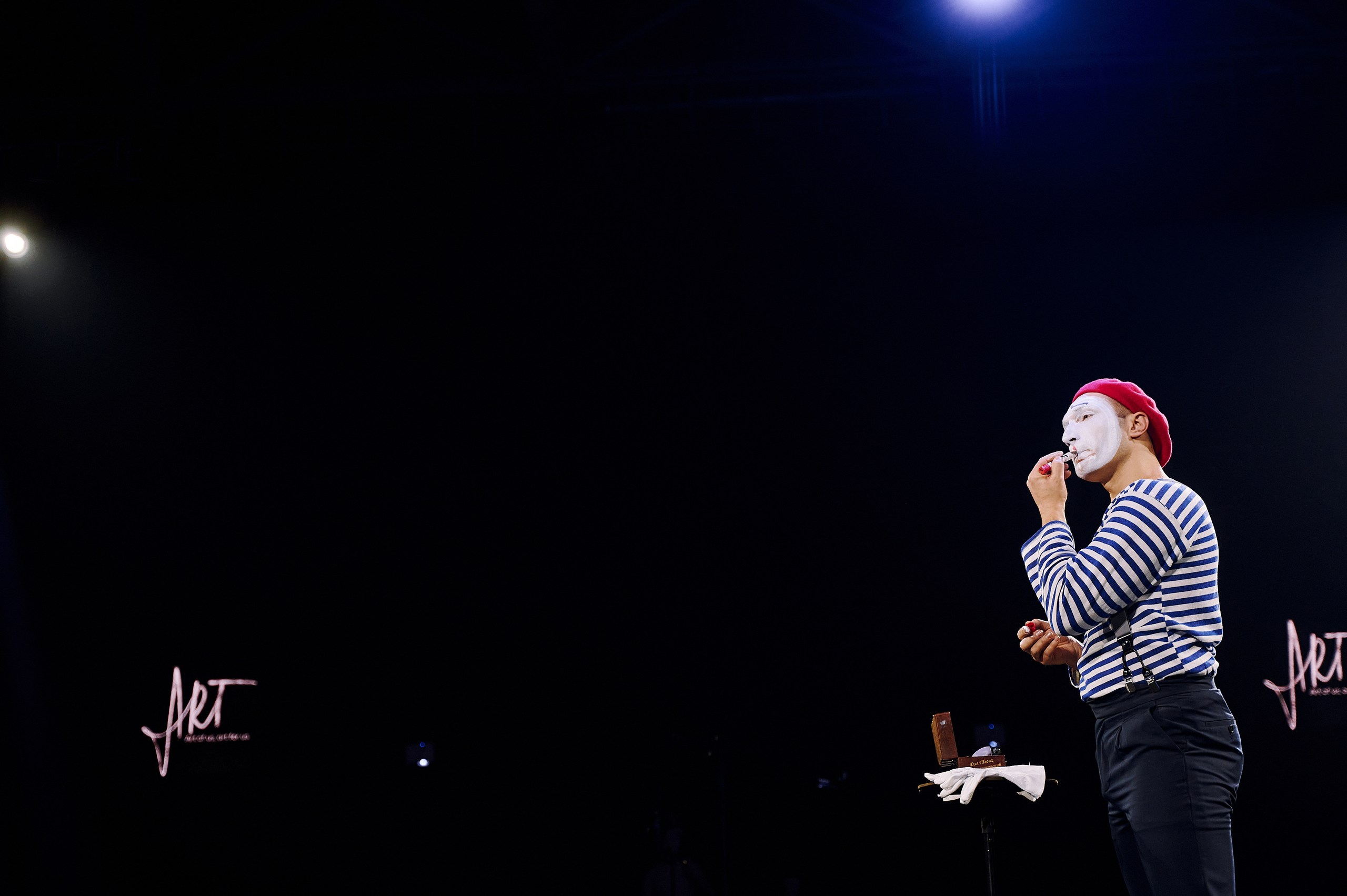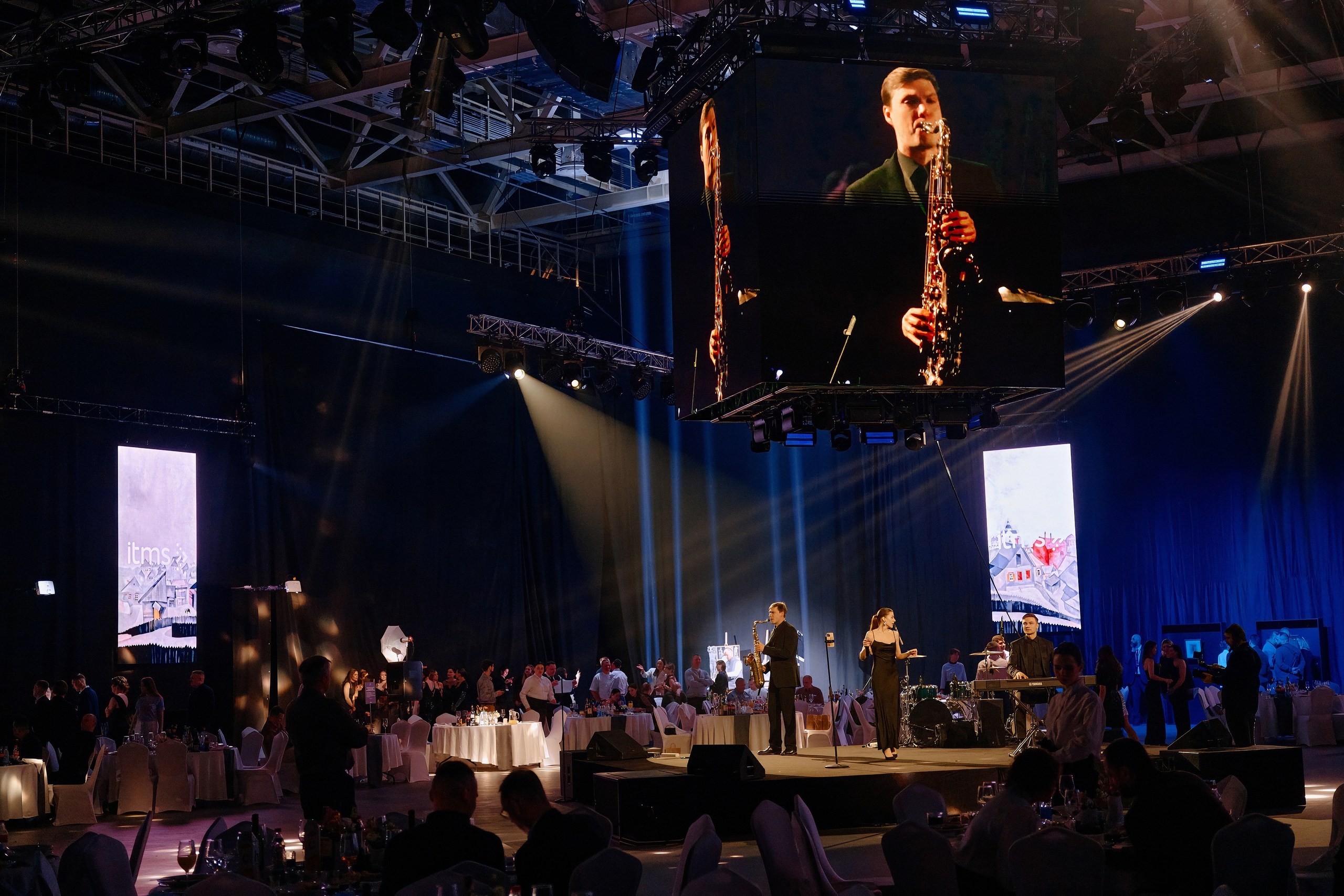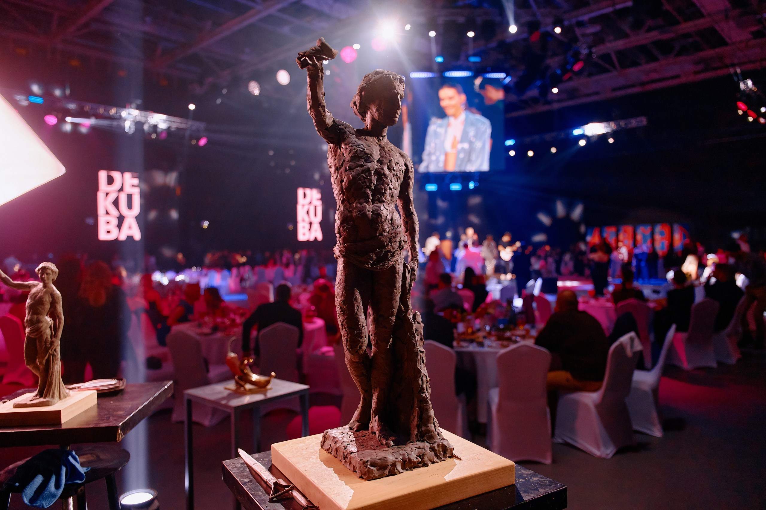 • Сценография: пол, залитый ожившими проекциями знаменитых полотен, центральная сцена под светящимся LED-кубом для идеального обзора, зеркальные шары, LED-экраны по периметру зала и свет, как главный художника вечера.