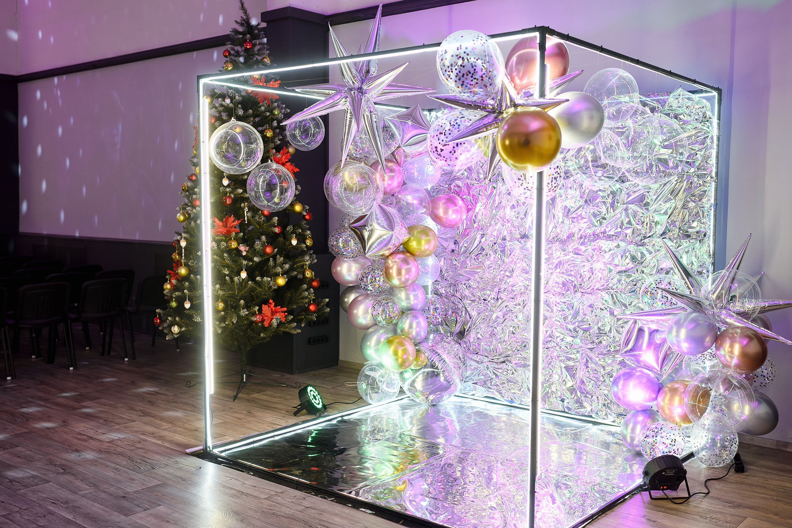 - Апгрейд фотозоны в футуристическом серебряном стиле создающее яркий визуальный эффект: инсталляция из воздушных шаров разных размеров и фактур, зеркальное покрытие пола,